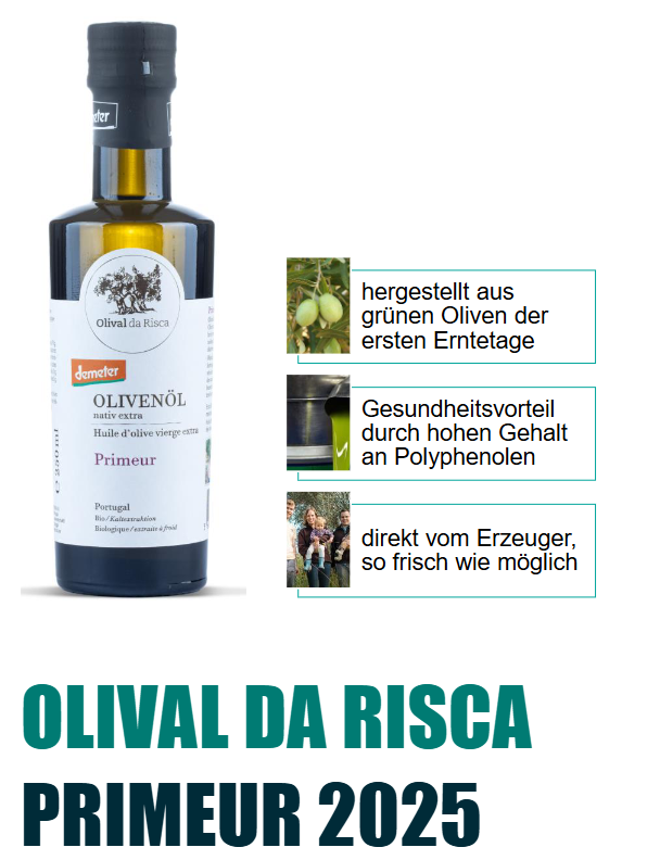 Erleben Sie mit Primeur ein außergewöhnliches Olivenöl, das nur einmal im Jahr aus den allerersten Oliven der Erntesaison gewonnen wird. Dieses Öl begeistert durch seine intensive, frisch-fruchtige Note und einen beeindruckend hohen Gehalt an Polyphenolen, die für besonderen Geschmack und gesundheitliche Vorteile sorgen. Jeder Tropfen erzählt die Geschichte einer sorgfältigen Auswahl und zeitigen Ernte, die diesem Öl seine unvergleichliche Qualität verleiht. Tauchen Sie ein in das exklusive Aroma, das Primeur zu einem wahren Juwel für Genießer macht – eine einmalige Kostbarkeit, die Sie nicht verpassen dürfen! Ein Olivenöl von Risca Grande unserem Demeter Produzenten.
